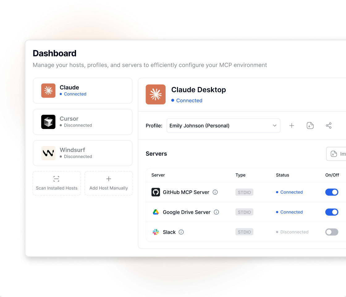 Control all MCP hosts and servers from a single, sleek dashboard.