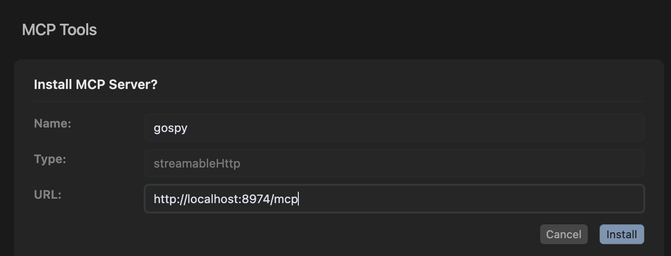 --pid/-p - Target process ID (required)--bin/-b - Path to binary file (optional)--json/-j - Output results in JSON formatGET /goroutines?pid=<pid> - List all goroutinesGET /memstats?pid=<pid> - Get memory statisticsGET /runtime?pid=<pid> - Get runtime version infoThe MCP server provides an http (streamableHTTP) endpoint. To enable: