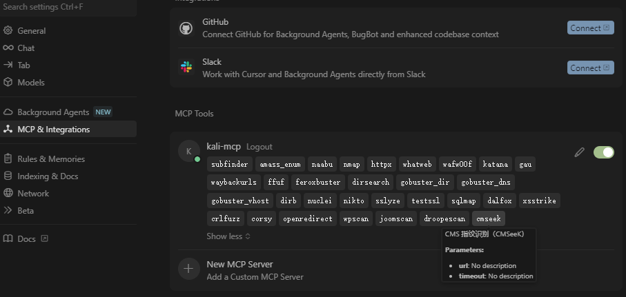 extras-installer/modules/config.json/capabilities_extgit clone <repo-url> cd KALI_MCP_SERVER docker compose up -d --build