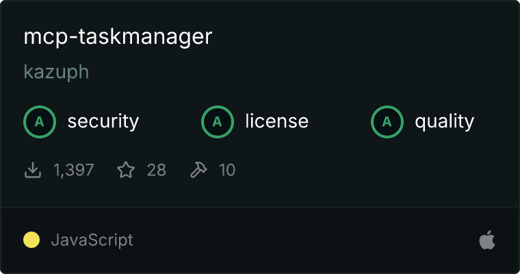 { "tools": { "taskmanager": { "command": "npx", "args": ["-y", "@kazuph/mcp-taskmanager"] } } }
