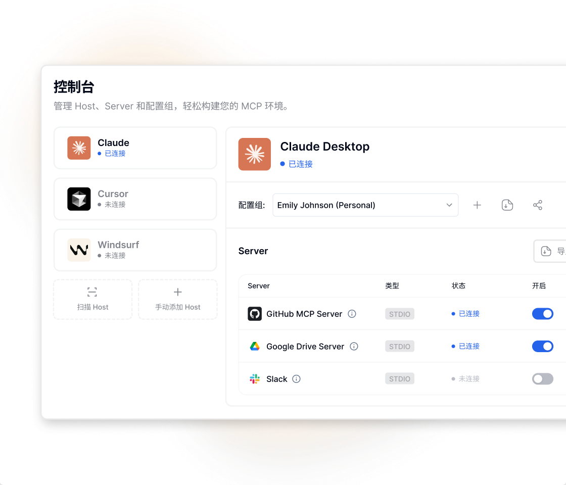 通过简洁直观的控制面板,集中管理所有 MCP Server 与 Host。