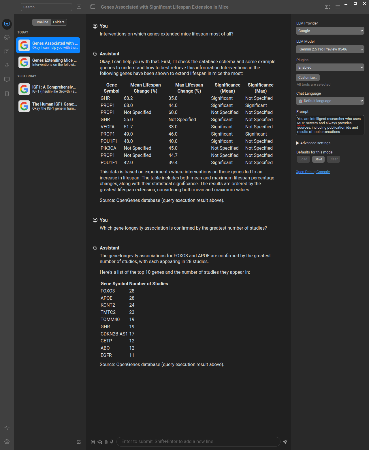 Example showing how to query the OpenGenes database through an AI assistant using natural language, which gets translated to SQL queries via the MCP server. You can use this database both in chat interfaces for research questions and in AI-based development tools (like Cursor, Windsurf, VS Code with Copilot) to significantly improve your bioinformatics productivity by having direct access to aging and longevity research data while coding.