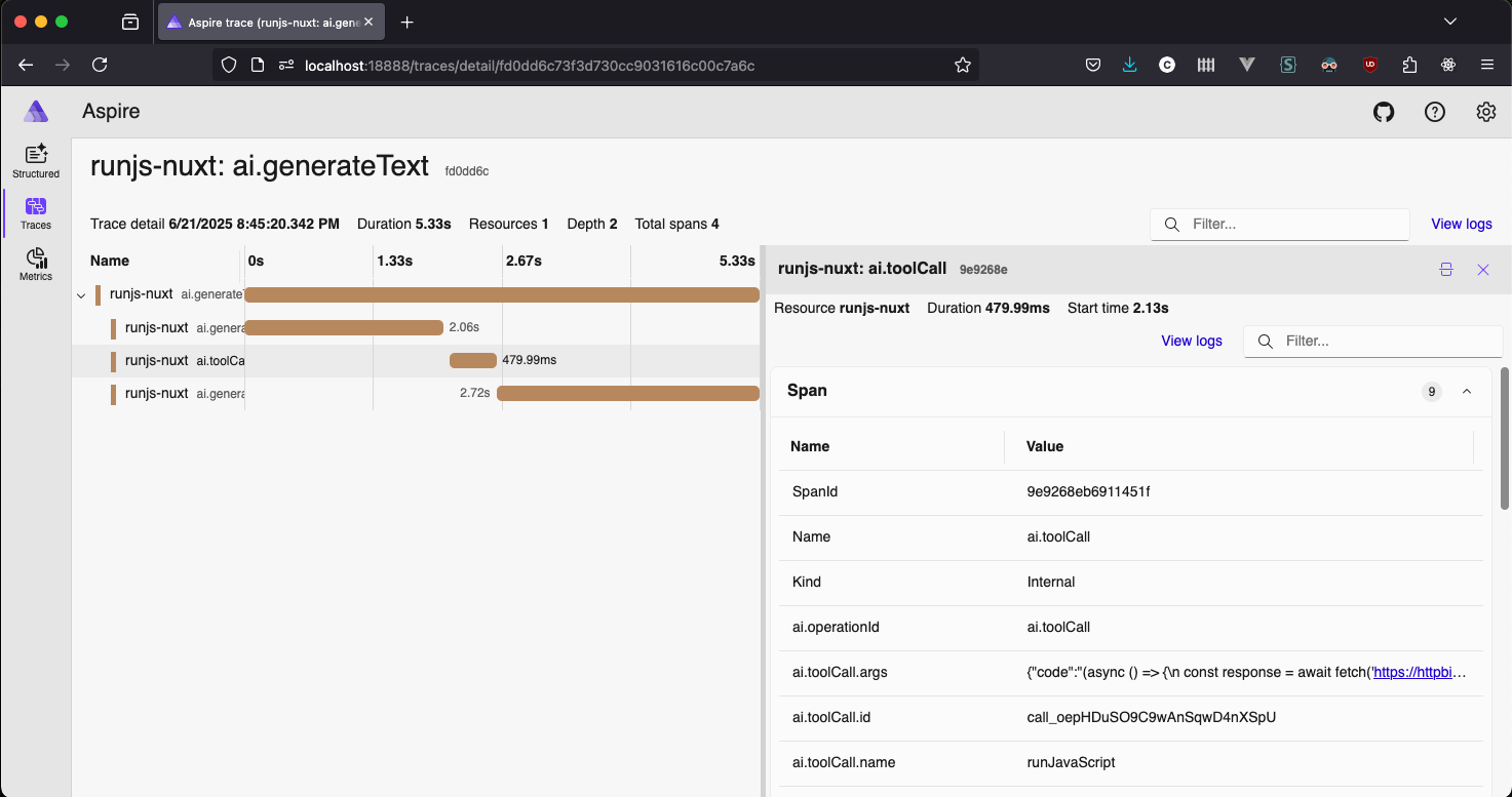 You will also get the Aspire Dashboard at http://localhost:18888 to trace the internal calls to the tools.